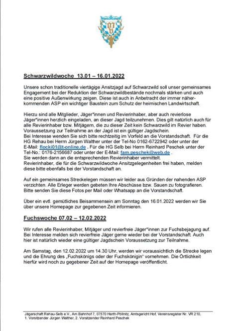 Vielen Dank an alle Beteiligten und Danke an die Revierpächter, die Jägern die Möglichkeit gegeben haben, eventuell Schwarzwild zu erlegen.