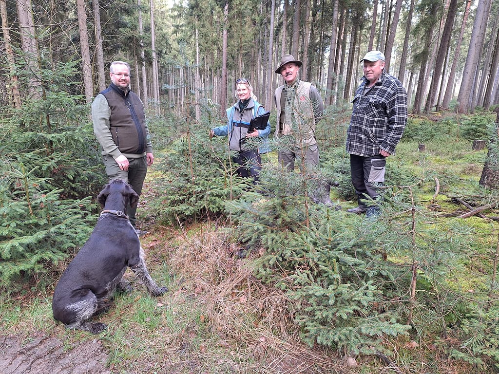 Aufnahmepunkt zum Verbissgutachten im Revier Vielitz mit Jagdgenosse Wolfgang Reinel, Mitpächter Dr. Günther Gräßel, Revierförsterin am AELF Münchberg-Bayreuth Nina Ledermüller und Hegegemeinschaftsleiter Andreas Beck.