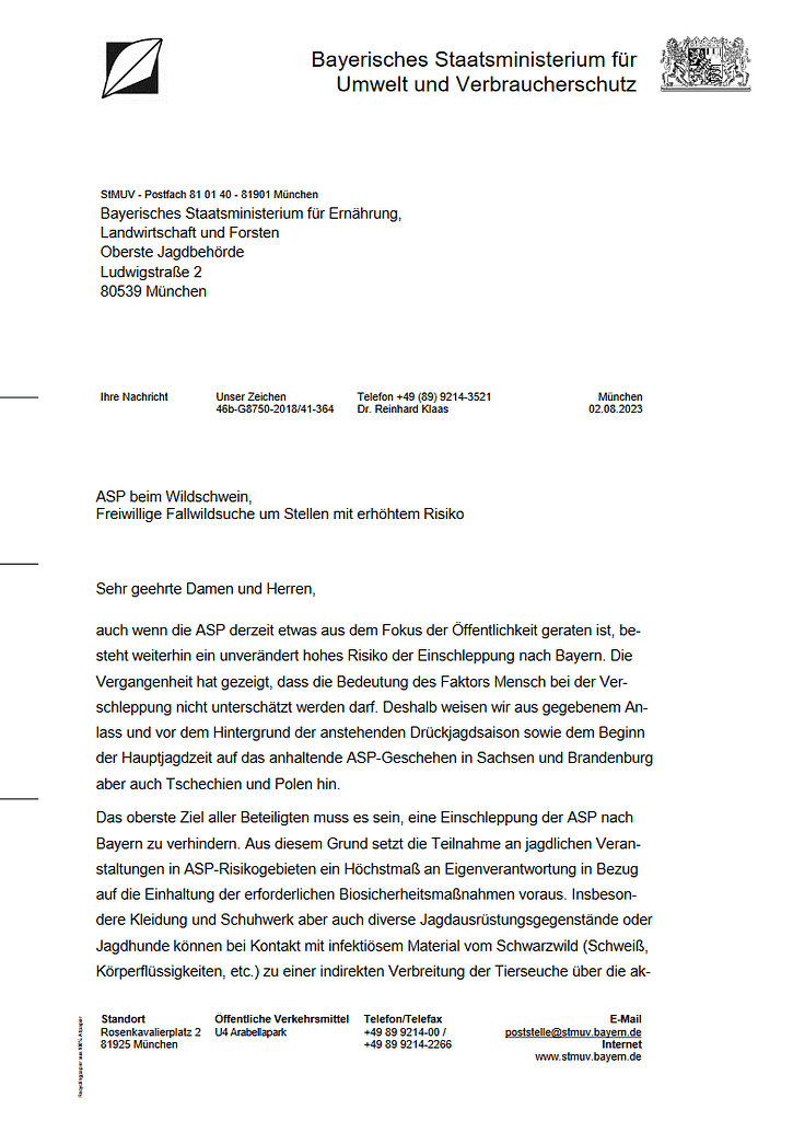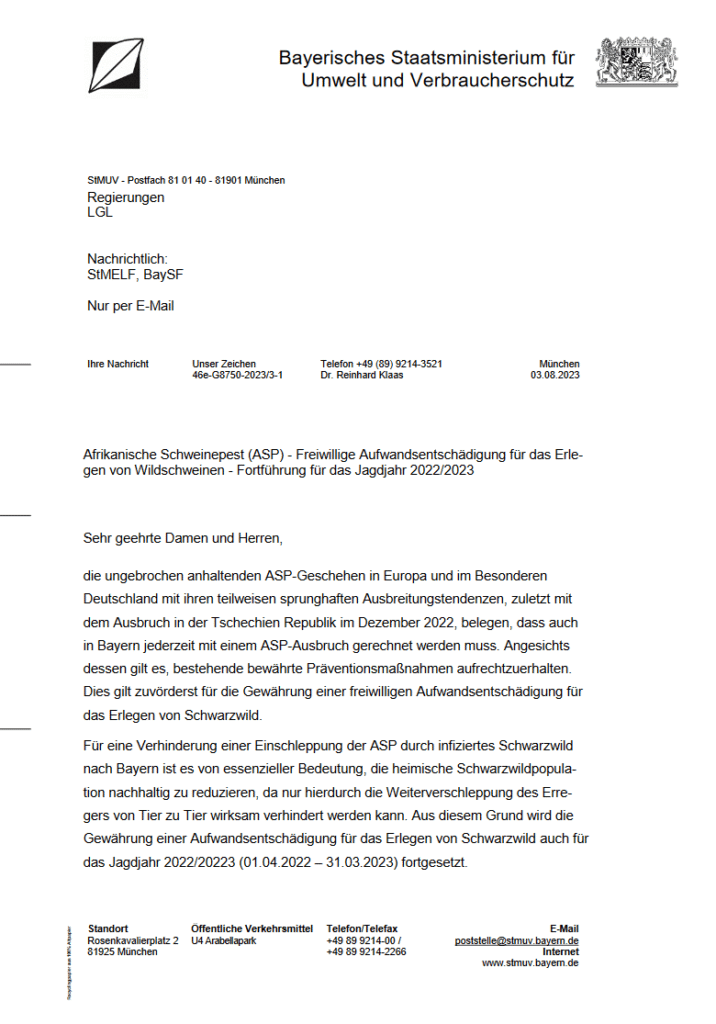 die ungebrochen hochdynamischen ASP-Geschehen in Europa und im Besonderen Deutschland mit ihren teilweisen sprunghaften Ausbreitungstendenzen führen ein-dringlich vor Augen, dass auch in Bayern jederzeit mit einem ASP-Ausbruch gerech-net werden muss. Angesichts dessen gilt es, die bereits erfolgreich etablierten und bewährten Präventionsmaßnahmen aufrechtzuerhalten. Dies gilt insbesondere für die Gewährung einer Aufwandsentschädigung für das Erlegen von Schwarzwild.