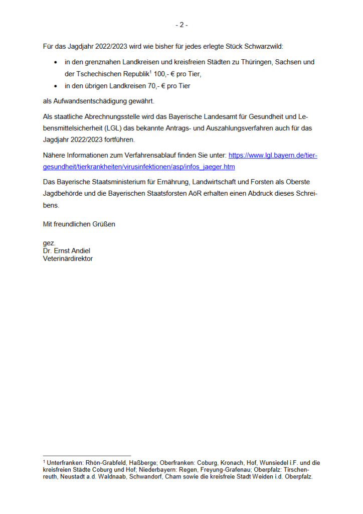 Für Schwarzwild, das in Revieren erlegt wurde, die in Landkreisen liegen, welche an Thüringen, Sachsen oder der Tschechischen Republik angrenzen, wird eine erhöhte Aufwandsentschädigung für das Jagdjahr 2020/2021 geleistet. Auch da gilt die zusätzliche Dokumentationspflicht! s.o.