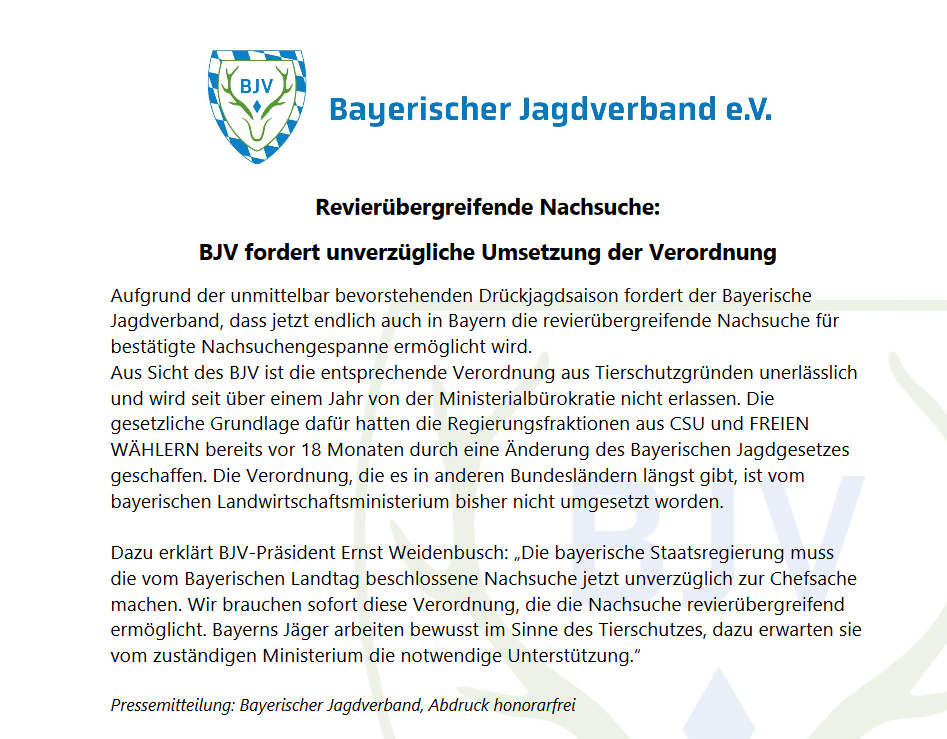 Aufgrund der unmittelbar bevorstehenden Drückjagdsaison fordert der Bayerische Jagdverband, dass jetzt endlich auch in Bayern die revierübergreifende Nachsuche für bestätigte Nachsuchengespanne ermöglicht wird.