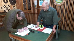Ein Durchgang wird gerade geschossen, aufmerksam wird das Schießen vom fachkundigen Publikum beobachtet. Diese warten auf ihren Schießdurchgang.